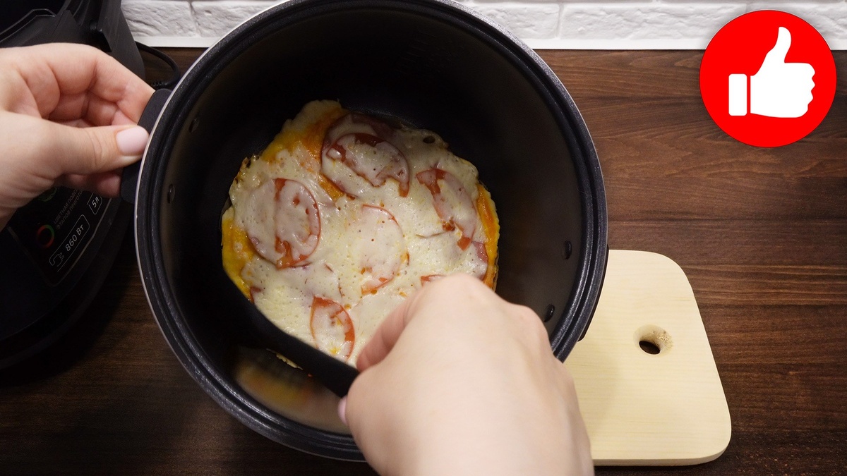 Готовую пиццу перенесите в чашу мультиварки и готовьте 25 минут в режиме "пицца" или "выпечка". Удивите близких и друзей нежным вкусом и ароматом свежеприготовленной пиццы!