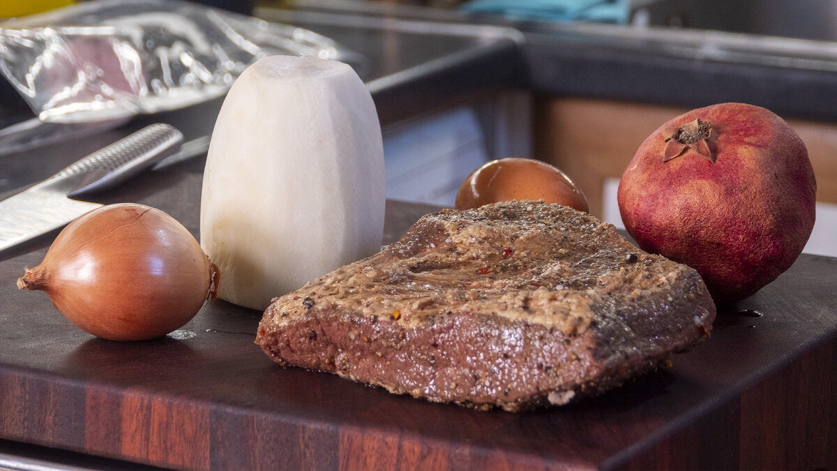 С сочетанием запеченной говядины и редьки, этот салат обретает не только уникальный вкус, но и великолепный вид. Яркие зерна граната и свежая зелень добавят праздничного настроения к любому столу. Вот что вам понадобится: