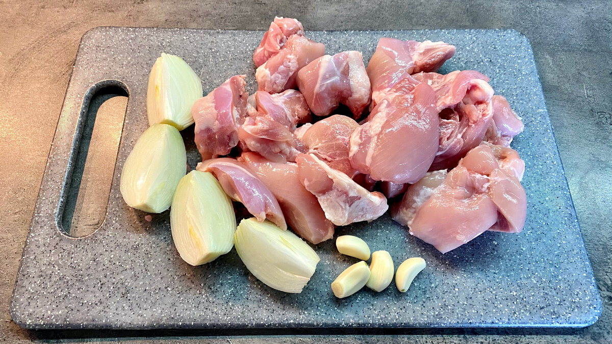 Для этого рецепта отлично подойдет куриное мясо — например, бедра. Однако можно экспериментировать со свининой, лучше всего брать лопатку. Состав ингредиентов: