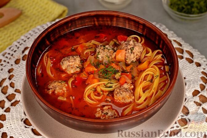 - Суп с фрикадельками и лапшой: Простое, но вкусное сочетание фрикаделек, целебного овощного соуса и лапши покоряет сердца всех любителей домашней кухни. Яркий цвет и насыщенный вкус на основе томатной пасты делают это блюдо особенно заманчивым.