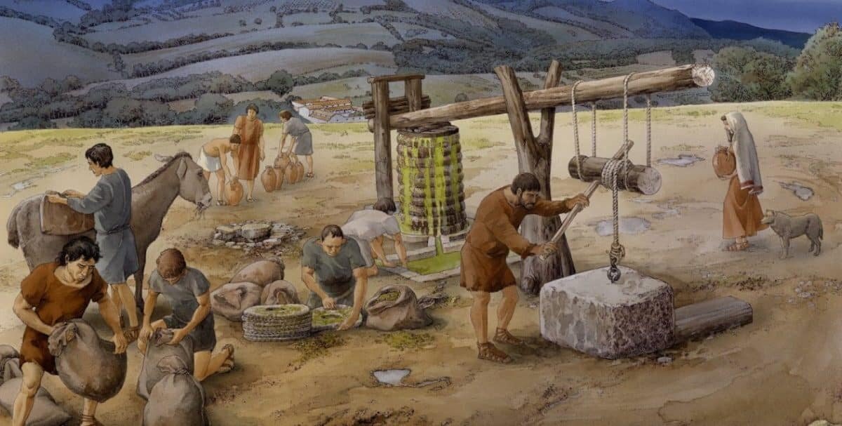 Стадия революции в производстве масла наступила в железном веке с изобретением вращающегося жернова для измельчения оливок, что значительно упростило процесс отжима. Найденные археологами каменные жернова из VII века до нашей эры говорят о том, что умение добывать масло использовалось не только финикийцами и греками, но и местными народами.