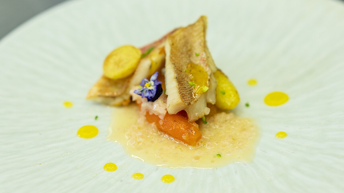 Для сервировки на тарелке разместите запеченного окуня и овощи, полейте соусом берблан, добавьте картофельные шарики и украсьте блюдо апельсиновым гелем и лепестками цветов. Это гастрономическое произведение искусства непременно станет центральным элементом любого стола!