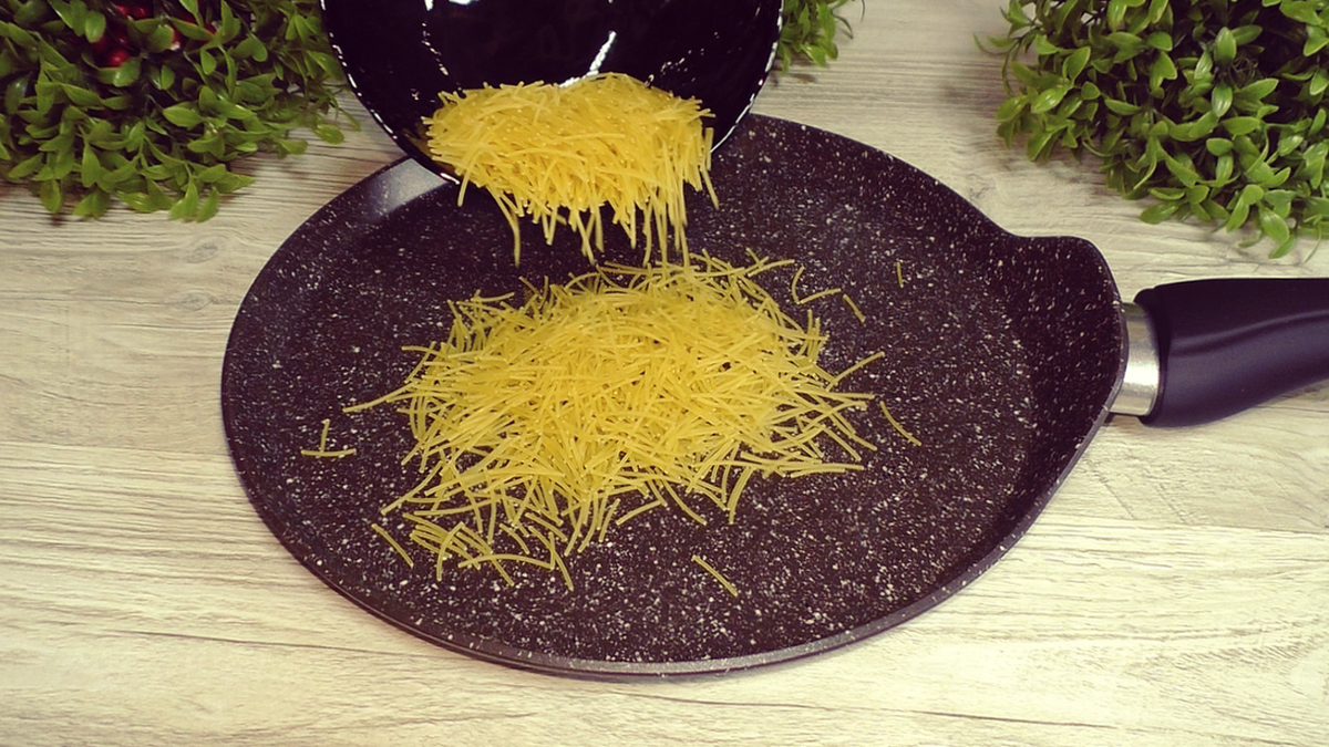 Первым делом нужно обжарить вермишель. Делается это на сухой сковороде до появления золотистой корочки. Как только вермишель подрумянится, её стоит переложить в тарелку, чтобы прекратить процесс жарки и избежать пригорания.