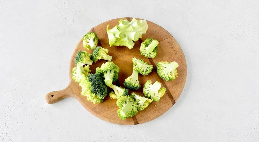 Сначала важно разобрать брокколи на соцветия. Стебель овоща можно отложить для использования в других блюдах, например, в овощном супе. Каждое соцветие стоит разрезать вдоль пополам, чтобы получить ровные срезы, которые будут равномерно обжариваться.