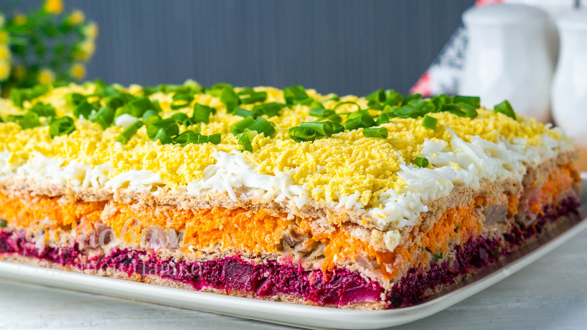 Необычный закусочный торт с сельдью способен поразить ваших гостей на праздничном столе. Этот вариант представляет собой оригинальную интерпретацию классической «селедки под шубой» и станет настоящим гастрономическим открытием.