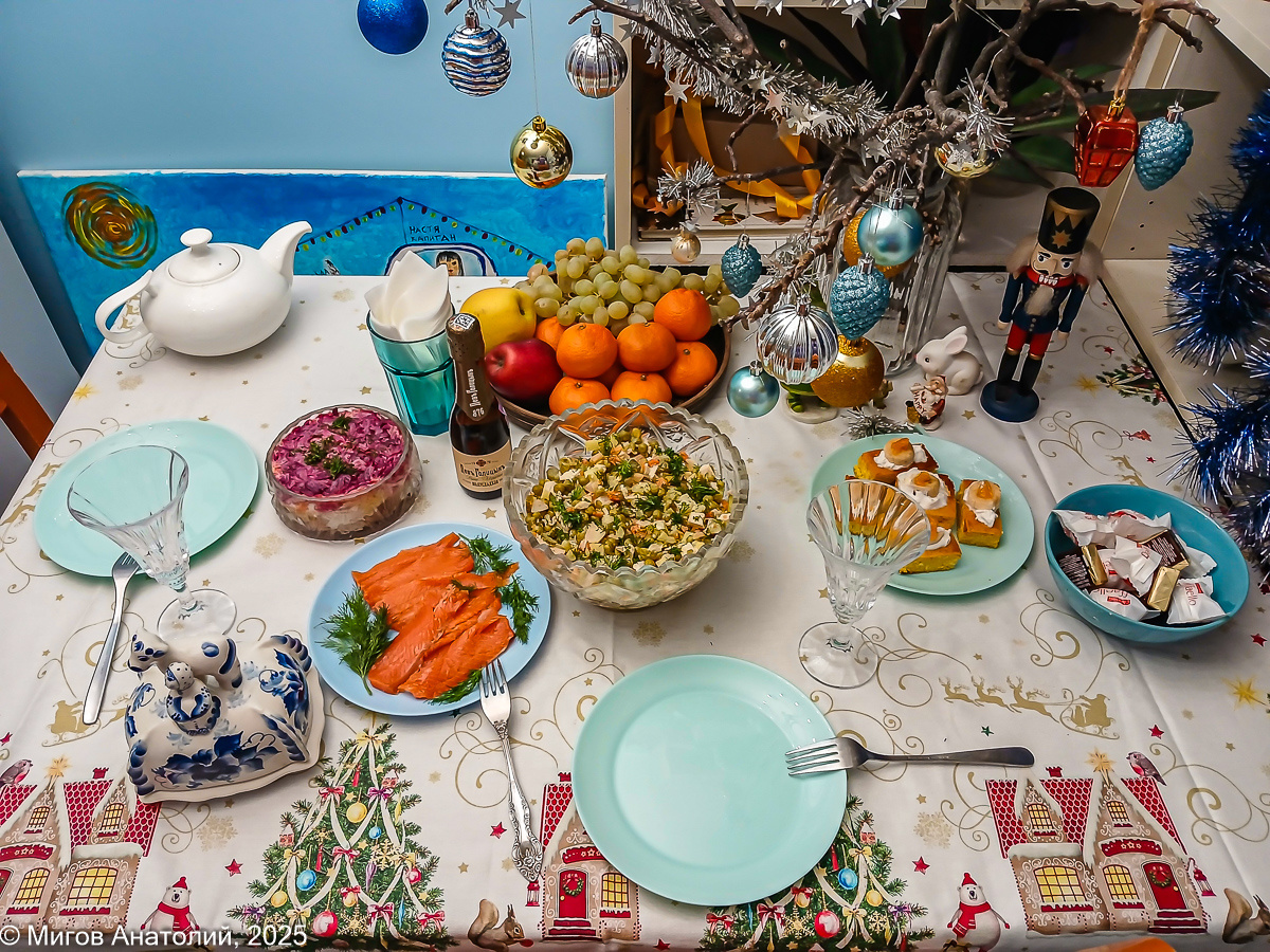 Празднование 2026 года прошло более весело и обильно, чем в 2025-м, когда праздник был отмечен в кругу семьи без шумных застолий. В этот раз стол был накрыт по всем канонам: классический салат оливье, селедка под шубой, малосольная форель и творожные тортики. Фрукты и конфеты дополнительно украсили стол. Одна небольшая бутылка шампанского на двоих вполне подошла для этого праздника, а за завтраком все остатки угощений ушли с удовольствием.