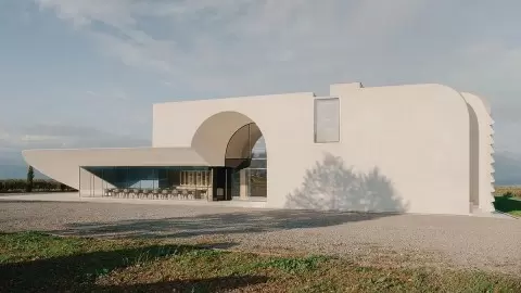 Главный фасад винодельни, вдохновлённый рисунком футуристических зданий, обращён к водоёму, создавая удивительное зрелище. Монолитные каменные формы, акцентированные арочными проёмами, придают конструкции уникальность, играя с восприятием форм и пространств.