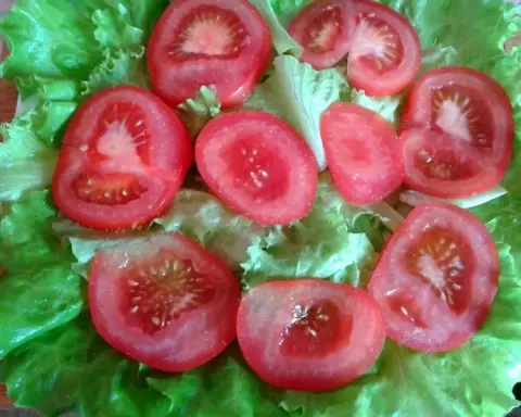 На большой плоской тарелке разложите рваные кусочки салата. После этого нарежьте помидоры в крупные слайсы и равномерно распределите по листьям. Лучше использовать черри — они сладкие и ароматные. Не забудьте слегка подсолить помидоры.