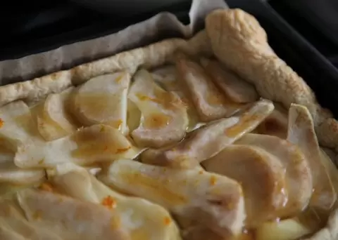 6. На тесто уложите первый слой из сыра, сверху равномерно распределите ломтики груш.