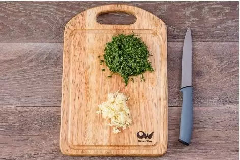 Шаг 1: Духовку необходимо разогреть до 200°С. Чеснок очищается и мелко рубится, так же как и кинза вместе со стеблями.