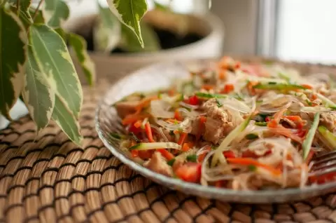 Нейтральная основа, которая отлично дополнит любое блюдо. Быстро обжаривается мясо с луком и морковкой, добавляются перец и соус, затем лапша заливается кипятком и соединяется с начинкой. Свежий огурец, помидор и зелень добавляют яркости. Готовить можно заранее начинку, фунчозу — перед подачей, чтобы сохранить текстуру.