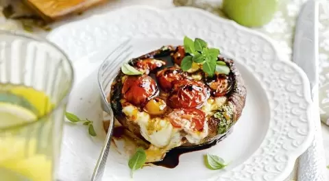 Шаг 4: Готовые грибы переложите на тарелку, полейте бальзамическим соусом и украсьте нарезанным базиликом.