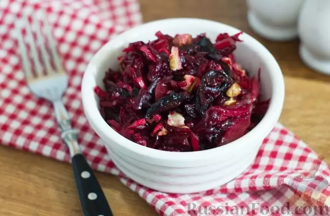 Салат из свеклы, яблока, соленых огурцов, чернослива и грецких орехов оказался ещё одним интересным вариантом. Сочетание отварной свеклы, чеснока и орехов, дополненное хрустящими солеными огурцами и сочным яблоком, создаёт гармоничное угощение с заправкой из оливкового масла.