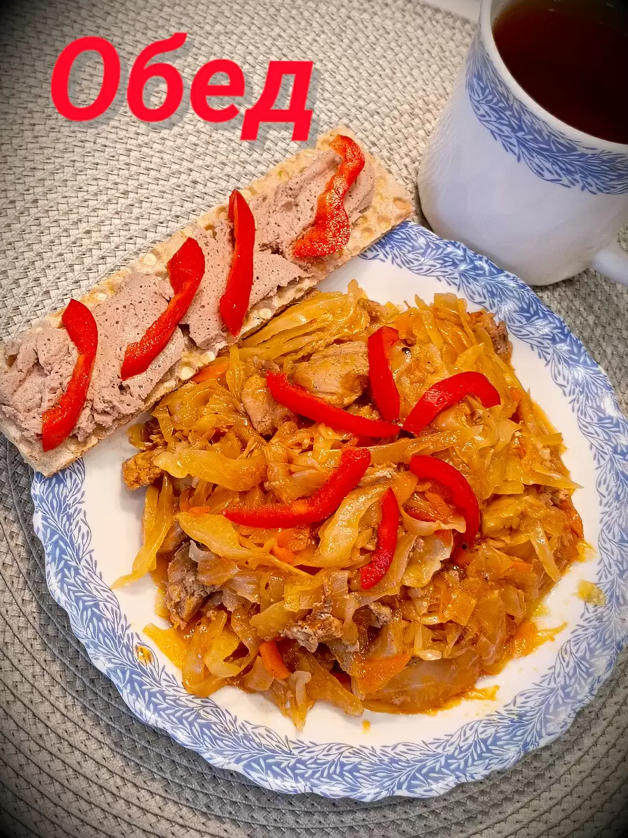 Сегодня на обед был приготовлен аппетитный дуэт — тушёная капуста с индейкой, купленной накануне. Это блюдо готовится быстро и обладает насыщенным вкусом. Чтобы добавить немного разнообразия, к горячей капусте подали ржаной хлебец, на который был намазан паштет из печени индейки, также приготовленный заранее. В завершение, на капусту были добавлены полоски сладкого перца, что не только украсило блюдо, но и обогатило его вкус.
