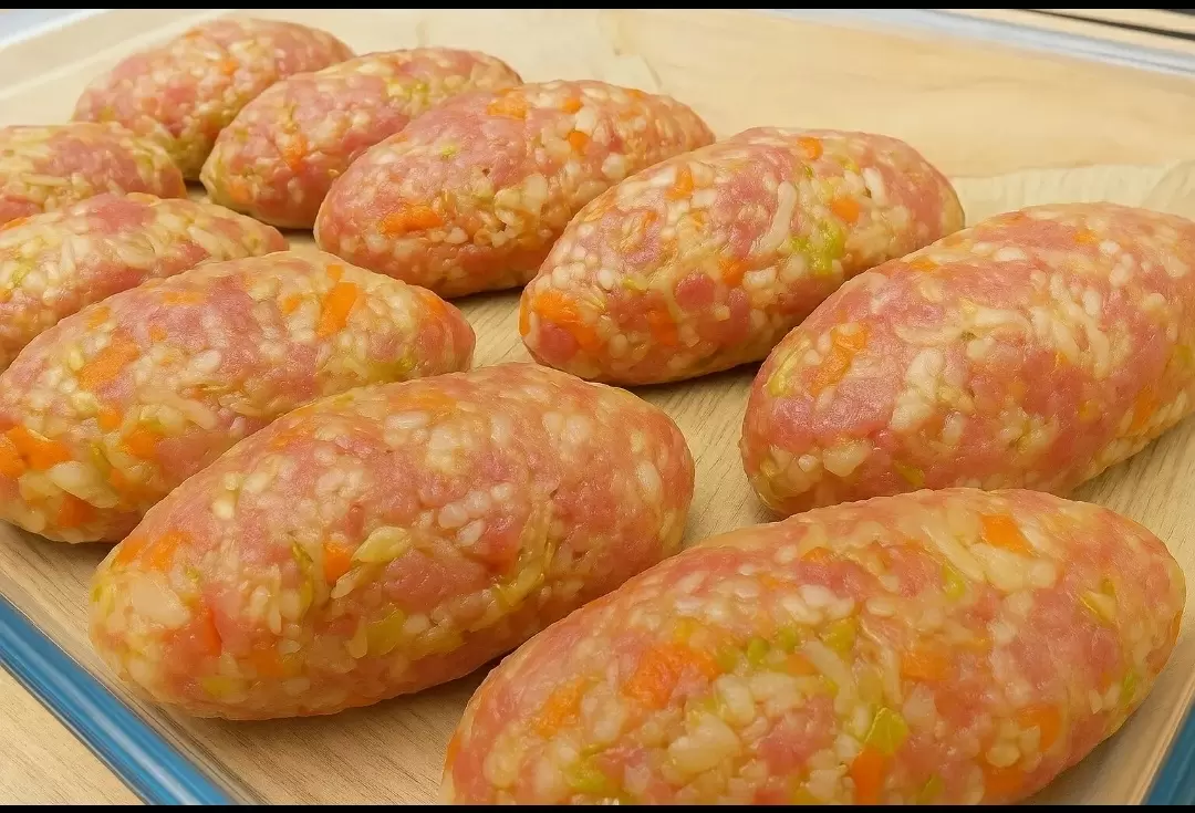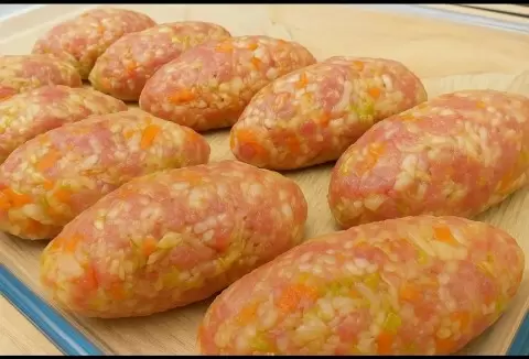 Смешайте мясо с остывшими овощами и рисом. Тщательно перемешайте, чтобы фарш стал сочным и ароматным.
