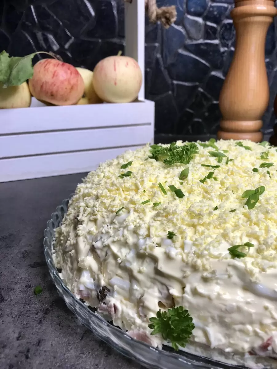 4. Завершите слои тертым сыром и яичным белком, снова полив майонезом.