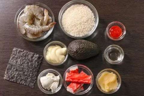 - Начинка: 1 авокадо, 60 г крабовых палочек, 250 г креветок (можно использовать варено-мороженые), 35 г икры мойвы, 45 г майонеза, 3 г соуса шрирача, 30 г творожного сыра.