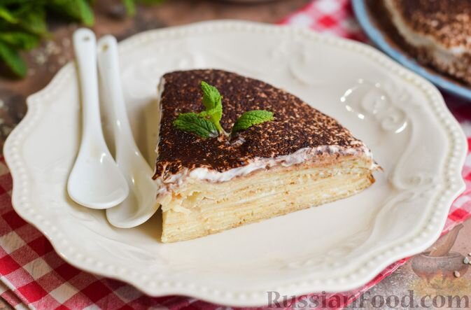 - Блинный торт со сметанным кремом и кофейной пропиткой. Этот нежный торт своими вкусовыми сочетаниями напоминает тирамису. Тонкие блины, замешанные на кефире, пропитаны ароматным кофе, а сверху их покрывает легкий сметанный крем.