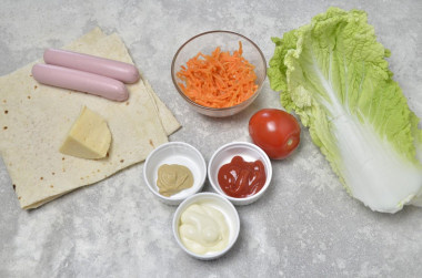Создание этого вкусного хот-дога начинается с подготовки ингредиентов. Возьмите два тонких лаваша и выберите сосиску — предпочтительно длинную, но могут подойти и короткие варианты.