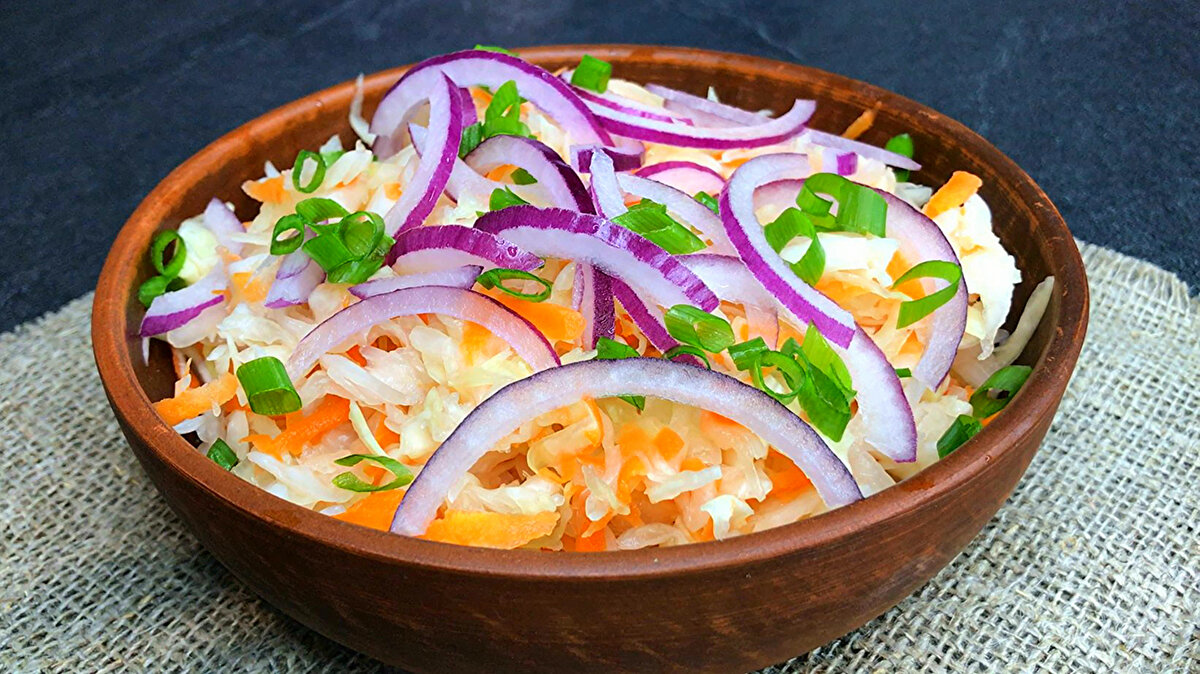 Через сутки капуста будет готова. Подавайте ее, присыпав луком и заправив душистым растительным маслом — это не просто вкусно, но и полезно.