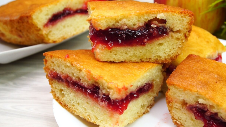 Разогрейте духовку до 200 градусов и запекайте тесто в течение 10 минут. Когда оно немного подрумянится, извлеките форму и добавьте начинку. Это может быть повидло, джем или густое варенье — любой предпочтительный вариант. После этого залейте оставшейся частью теста и продолжайте выпекать при 180 градусах еще 40 минут, ориентируясь на готовность.