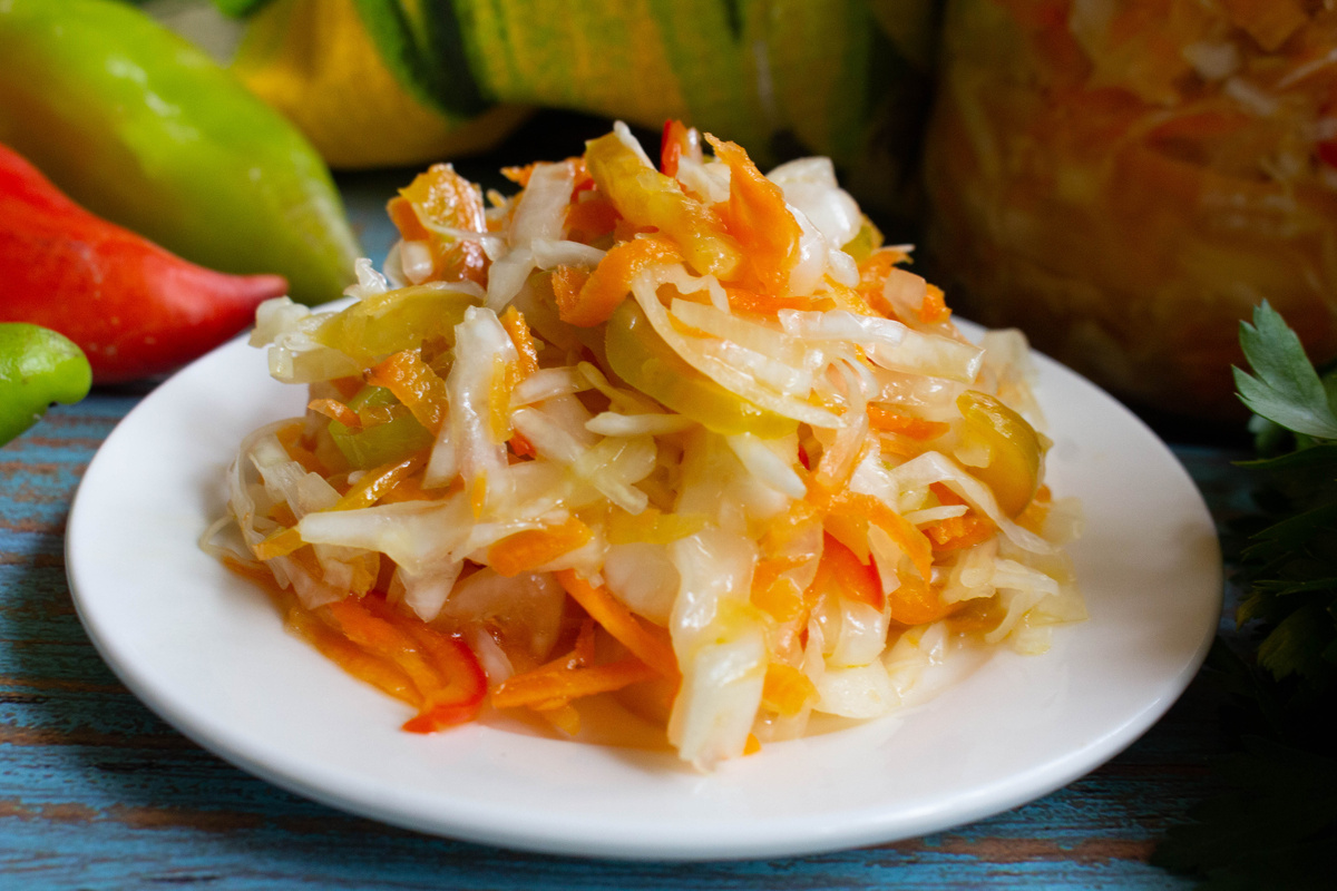 Этот маринованный салат привлекает внимание тем, что его можно сразу подать к столу, но с каждым часом он становится только вкуснее. Идеально подходит для приготовления в больших количествах, так как рецепт рассчитан на пять литровых банок. Хранить этот яркий и сочный салат лучше в холодильнике или в прохладном месте. Он прекрасно вписывается как в повседневное меню, так и в рацион постящихся, а также вегетарианцев.