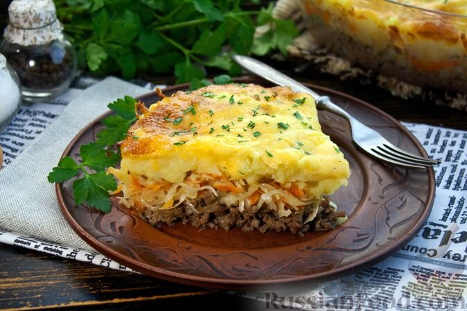 Картофельная запеканка с фаршем и капустой. Сытное блюдо немецкой кухни сочетает в себе простоту ингредиентов и яркие вкусы. Квашеная капуста делает запеканку особенно сочной.