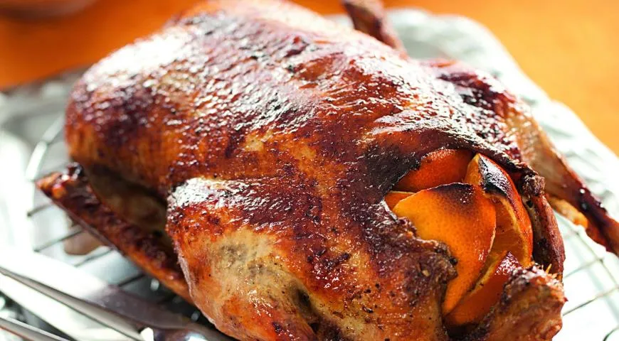 Классика, которая всегда украсит праздничный стол. Рекомендуется замариновать утку за 12 часов до готовки в смеси соевого соуса, меда и апельсинового сока для достижения мягкости и золотистой корочки. Не забудьте проколоть кожу в нескольких местах, чтобы соки не вытекали.