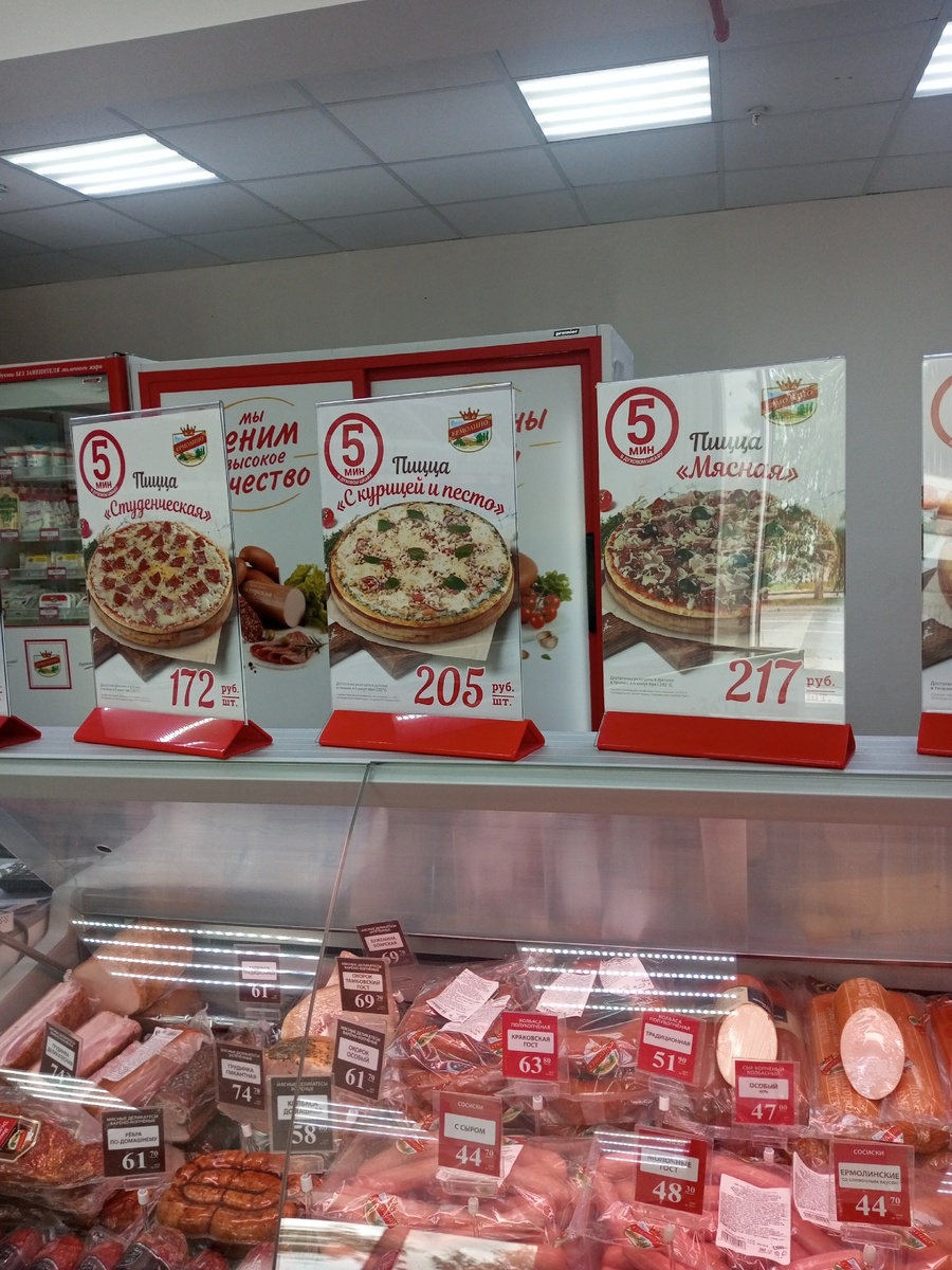 В ассортименте магазина можно обнаружить четыре вида пицц, однако на момент визита одна из них отсутствовала. В итоге выбор свелся к трём вариантам: "Студенческая", "Курица с соусом песто" и "Мясная", а также "Маргарита". Основным плюсом, который сразу бросается в глаза, являются низкие цены: целая пицца стоит от 172 до 217 рублей, что значительно выгоднее, чем в некоторых пекарнях, где цена за одну четвертую может достигать 110 рублей.