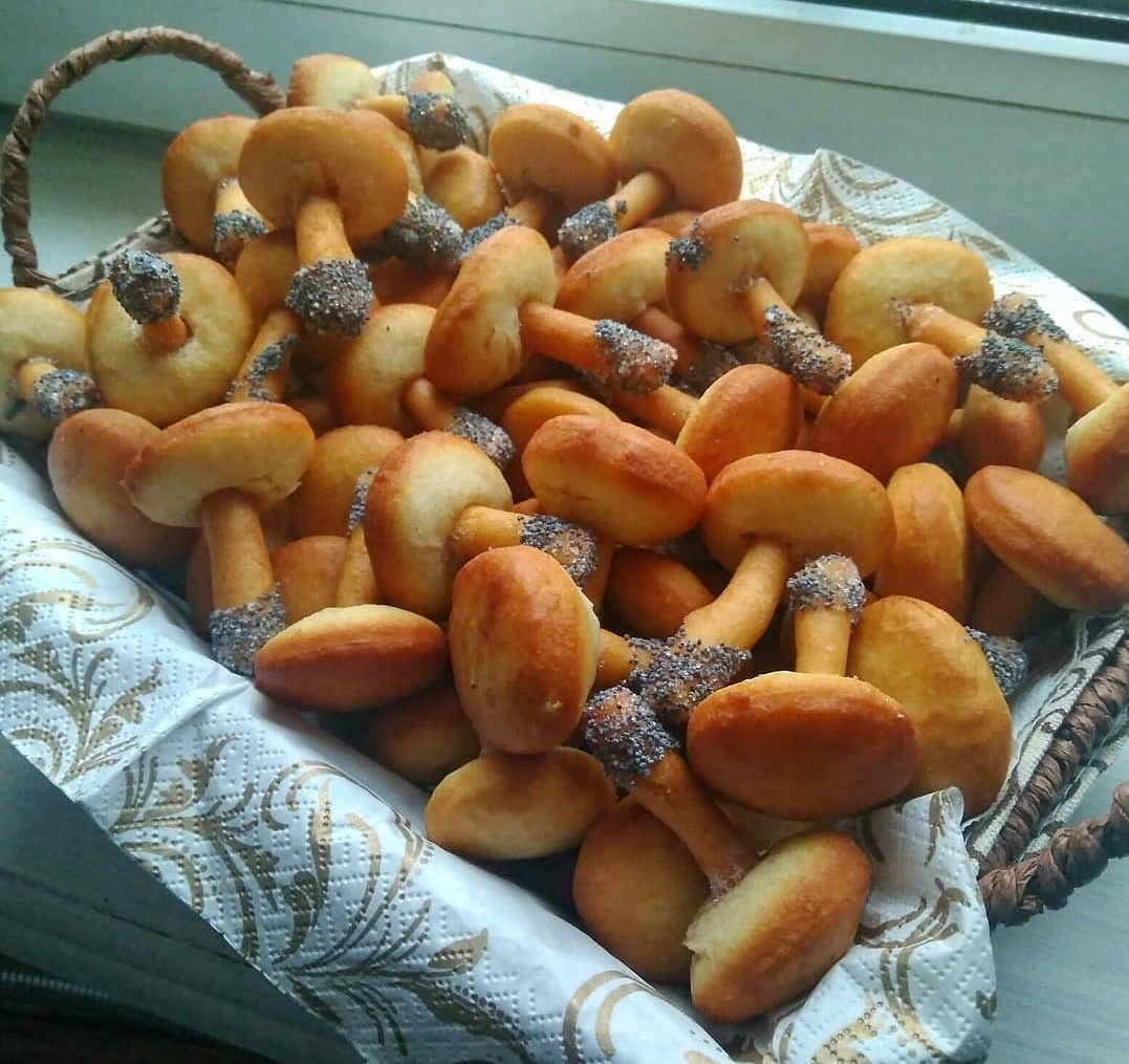 Кроме того, обмакните кончик ножки в белок с сахарной пудрой и затем в мак, смешанный с сахаром. Оставьте печенье высохнуть — наслаждайтесь уникальным десертом! Из представленных ингредиентов получится около 90 грибочков, которые будут отличным угощением для всей семьи.