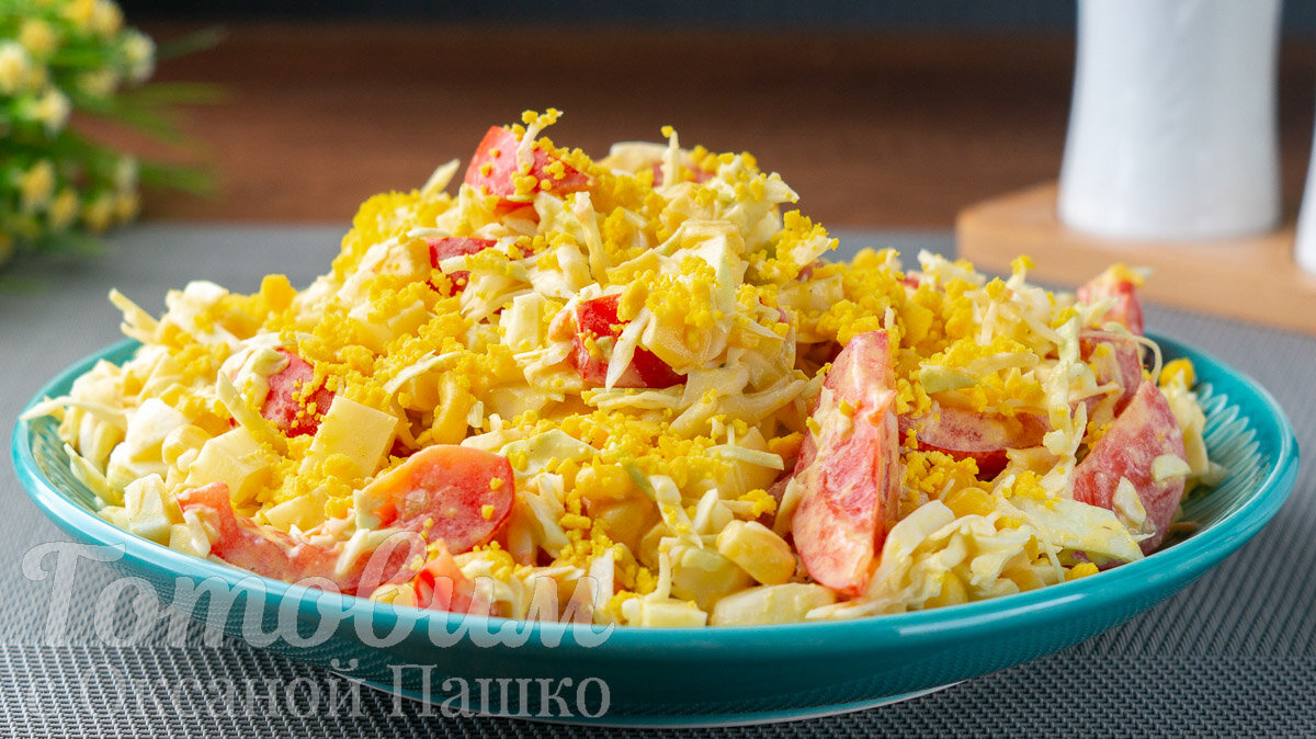 4. В соответствии с рецептом, в большую миску следует разместить нашинкованную капусту, нарезанные белки, кусочки сыра, кукурузу и помидоры. Приправить по вкусу и добавить приготовленную заправку, аккуратно перемешивая.
