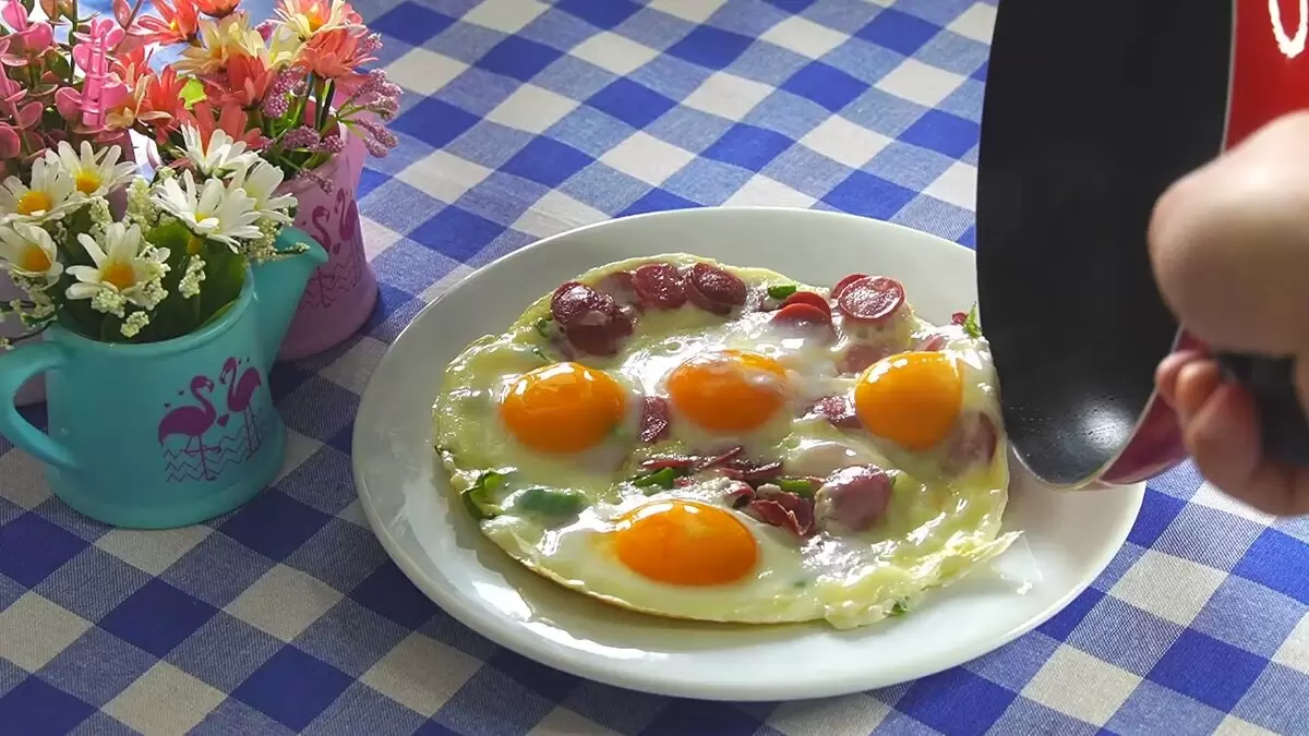 Как только овощи и колбаса подрумянятся, вбейте к ним яйца и готовьте до полной готовности. Не забудьте добавить соль по вкусу. Если хотите, накройте сковороду крышкой — так можно добиться разных вариантов готового блюда.