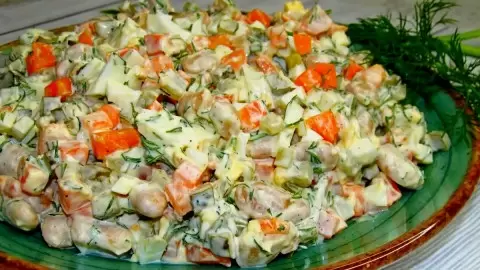 - Ингредиенты: морковь варёная — 2 шт., огурцы маринованные — 3 шт., яйца — 2-3 шт., консервированная фасоль — 1 банка, зелень укропа, чеснок — 2-3 зубчика, соль, перец и майонез по вкусу.