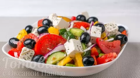 Не забудьте о сыре Фета, который нужно нарезать кубиками. Разложите его сверху на овощи, а затем присыпьте свежим или сушеным орегано и украсьте черными оливками. Результат — яркий, аппетитный греческий салат, который привнесёт в ваш стол атмосферу средиземноморского отдыха.