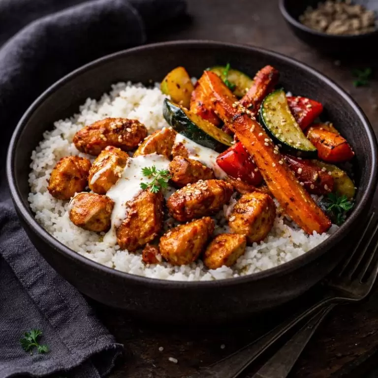 - Классический боул. Рис на дне, курица с паприкой сверху, рядом запечённые овощи, полейте соевым соусом или сметаной.