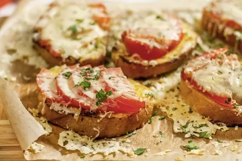 Шаг 3: Нарежьте помидор полукольцами. Застелите противень пергаментом и выложите на него обжаренные гренки. Сверху разместите помидоры и щедро посыпьте тертым сыром. Поместите противень в духовку на 2-3 минуты. Мелко нарежьте петрушку и посыпьте ей готовые гренки перед подачей. Наслаждайтесь сразу же!