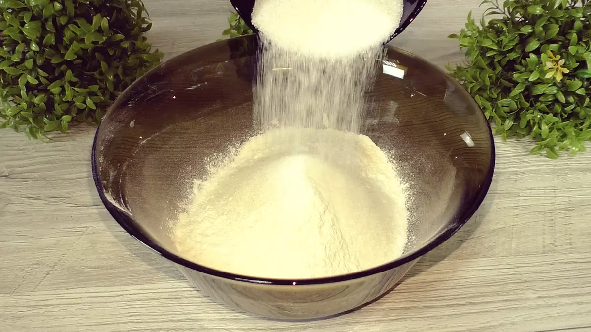 Сначала необходимо смешать все сухие ингредиенты: муку, щепотку соли, сахар, ванилин и разрыхлитель в глубокой миске. Используя венчик, тщательно перемешать их до однородности.