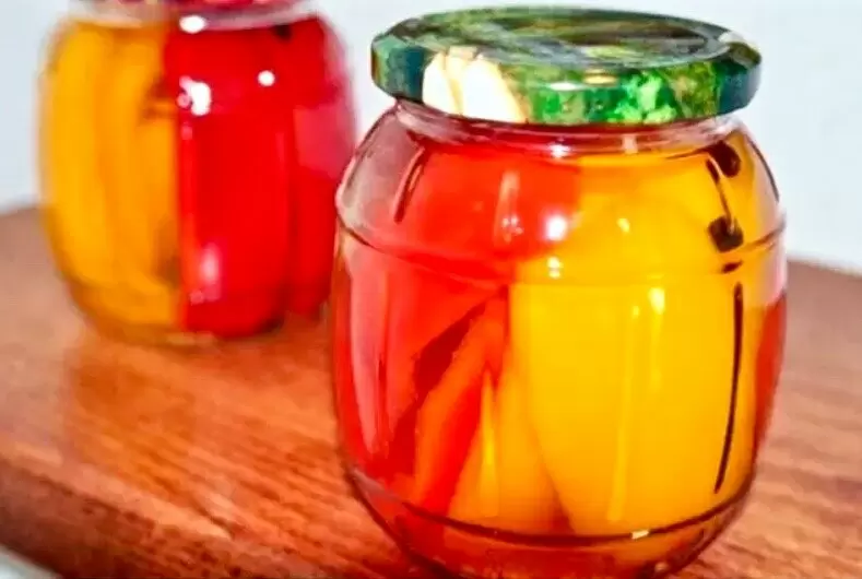 Перцы тщательно промываются, очищаются от семян и нарезаются полосками. Затем в кастрюлю добавляются вода, соль, сахар, специи, растительное масло и немного чеснока. После этого следует довести смесь до кипения и добавить нарезанные перцы, варить 10 минут.