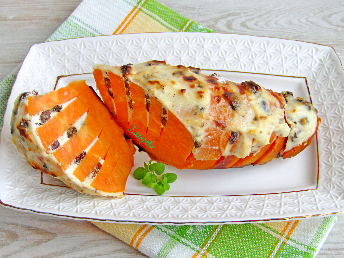 Когда батат будет готов, его нужно аккуратно достать из духовки, развернуть фольгу и нафаршировать творожной пастой. Для этого следует осторожно раздвинуть надрезы и заполнить их ароматной начинкой.