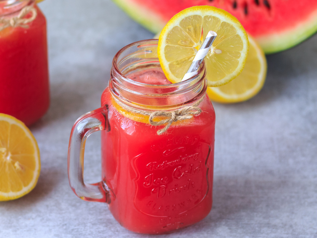 Теперь аккуратно смешайте арбузный сок с процеженным сиропом и добавьте 125 мл лимонного сока, проработав в блендере еще 20–30 секунд. Чтобы добиться нужной консистенции, разбавьте смесь холодной водой — отрегулируйте по вкусу: меньше воды придаст напитку яркость, а больше — легкость и освежающий эффект.