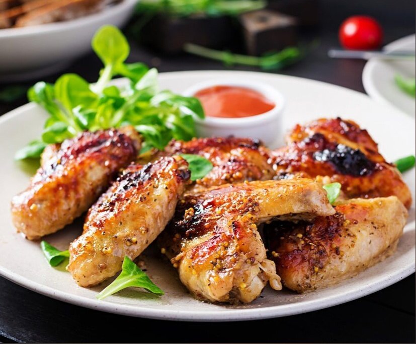 Готовые куриные крылышки выкладывают на красивую тарелку, украшенную свежими овощами и листьями салата. Не забудьте подать их с вашим любимым соусом! Приятного аппетита!