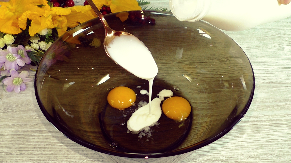 Приготовление начинается с того, что яйца взбиваются с солью, затем добавляется кефир и майонез, после чего всё тщательно перемешивается. Мука просеивается вместе с разрыхлителем, что делает тесто более воздушным. Консистенция должна быть такой, чтобы тесто легко снималось с ложки или лопатки.