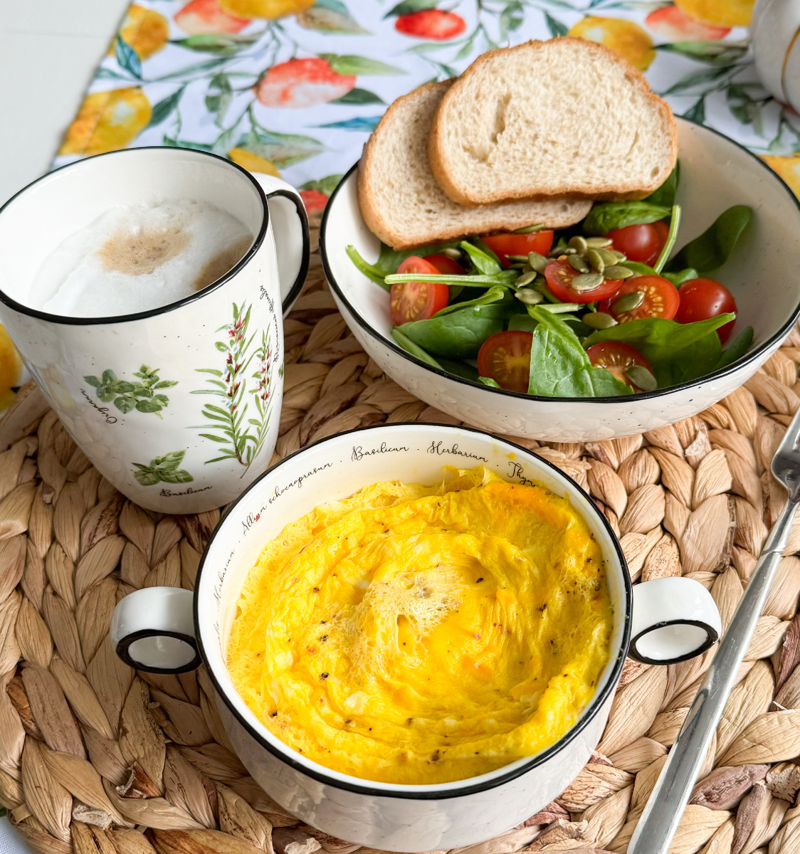 Каждое утро начинается с полноценного завтрака. Для этого меню предлагается омлет с салатом и кружкой кофе: