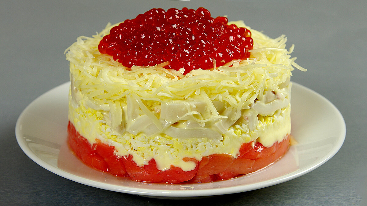 Следующим слоем идут кальмары, которые заранее можно перемешать с ложкой майонеза для необычного привкуса. Завершает композицию натертый сыр и красная икра. Удалите сервировочное кольцо, и салат будет готов к подаче!