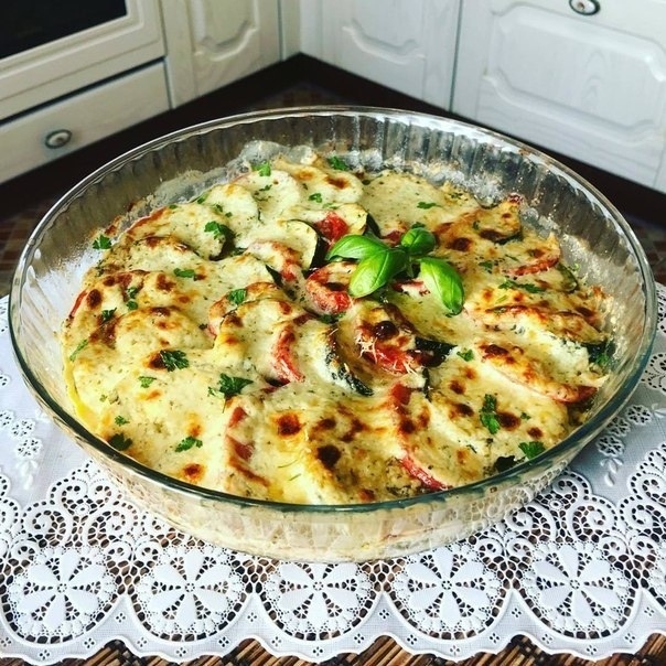 Затем выложить слой кабачков с помидорами, снова залить соусом и посыпать сыром. Поместить в заранее разогретую до 190 градусов духовку на 20-30 минут, до образования золотистой корочки.